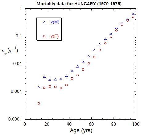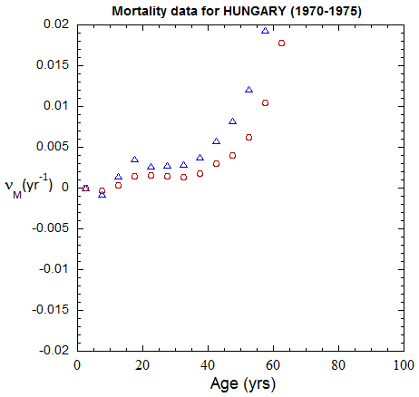 Figure II.A1a. Population rates (mislabeled “Mortality data”) rates inferred from ppn data for Hungary from 1970-2022, plotted on a linear scale. M: open diamonds. F: open circles.