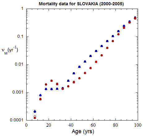 Fig II.B1. Population rates (mislabeled “Mortality data”) for Slovakia inferred from ppn data for Slovakia from 2000-2016, plotted on a logarithmic scale.