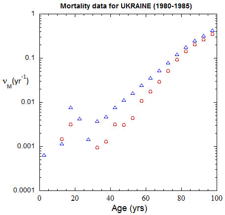 Figure III.3, III.B1. Age-stratified population rates (mislabeled “Mortality data”) derived from ppn population data for Ukrainian M (open diamonds) and F (open circles) from epoch 1980-1985 through epoch 2020-2025.