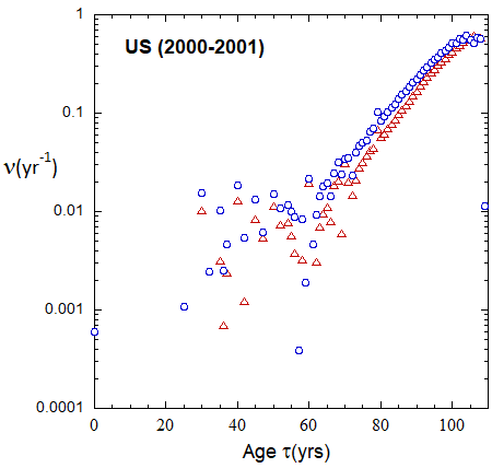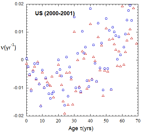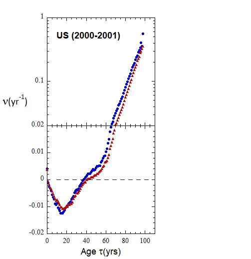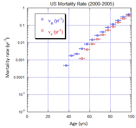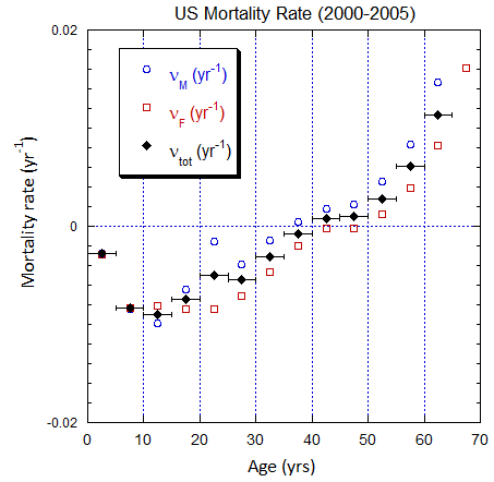 Figure V.B2. Total US population rates (mislabeled “Mortality Rate”) derived from US ppn population data from 2000-2025 (circles, M; squares, F; diamonds, average). The horizontal error bars on the average rates define the age ranges.