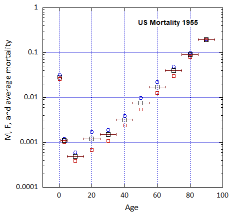 Figure VI.5. Total US M, F and average M+F mortality rates from 1955-2022.