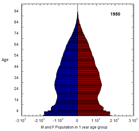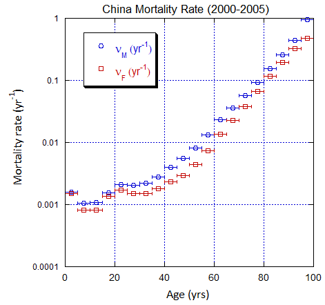 Figure V.C3. Evolving China M and F age-stratified population rates derived from ppn data for China. Note the regular behavior. Open circles: M, open squares: F.
