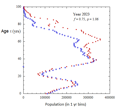 Figure VI.22. Animation of Loch Ness plots for 1-yr rates derived for the US from epoch 2000-2010 to epoch 2022-2023 from WPP/USCB data. Rates from 5-yr age-cohort (ppn) data are shown for comparison.