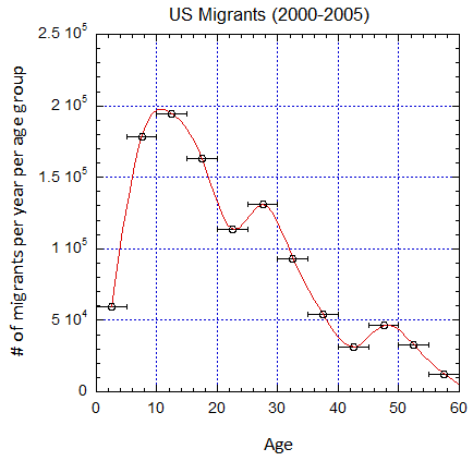 Figure V.B3. Implied number of migrants per year in the different age groups defined by the horizontal error bars from epoch 2000-2005 to 2025-2030 (UN projections for the later years) assuming a baseline 2019 mortality shown in Fig. V.B2. Cubic spline fits are shown.