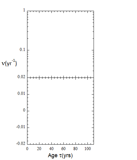 Figure V.C2. Evolving US M and F 5-yr ppn population rates (mislabeled “Mortality Rate”) averaged over the 5-yr range shown by the horizontal error bars, from epoch 2000-2005 to epoch 2025-2030. The effects of migration are large for ages ≲50 yo. The rates in old age approach mortality rates. See Fig. VI.22 for Loch Ness animation.