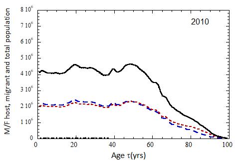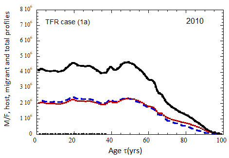 Figure VII.15a. Host (dotted), migrant (dot-dashed) and host + migrant (solid) total (M + F) profiles for the 2010 M (dashed) and F (short-dashed) profiles evolved to the year 2100. TFR model (a) is used for fertility and Fit 3 for mortality. Only migrants entering the US since 2010 are followed, and the migrant arrival rate is assumed to be equal to 1.18×106 migrants/yr after 2023