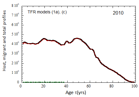 Figure VII.20a. US profile evolution starting from 2010 USCB population data and continuing to 2100. The profiles are evolved to 2020 with migration rates, mortalities, and fertilities as described in the text. After 2020, thick curves show the results when both host and migrant populations follow TFR model (a). Thin curves show results when host population follows TFR model (a) and the migrant population is assumed to have TFR = 2.0. After 2023, the migration-rate factor fm= 0.3, that is, the migrant arrival rate into the US is assumed to be 0.3% of the total host + migrant population in that year. Braided curve: host population evolution. Dot-dashed curves: migrant age distribution since 2010. Solid curves: age distributions of host + migrant population.